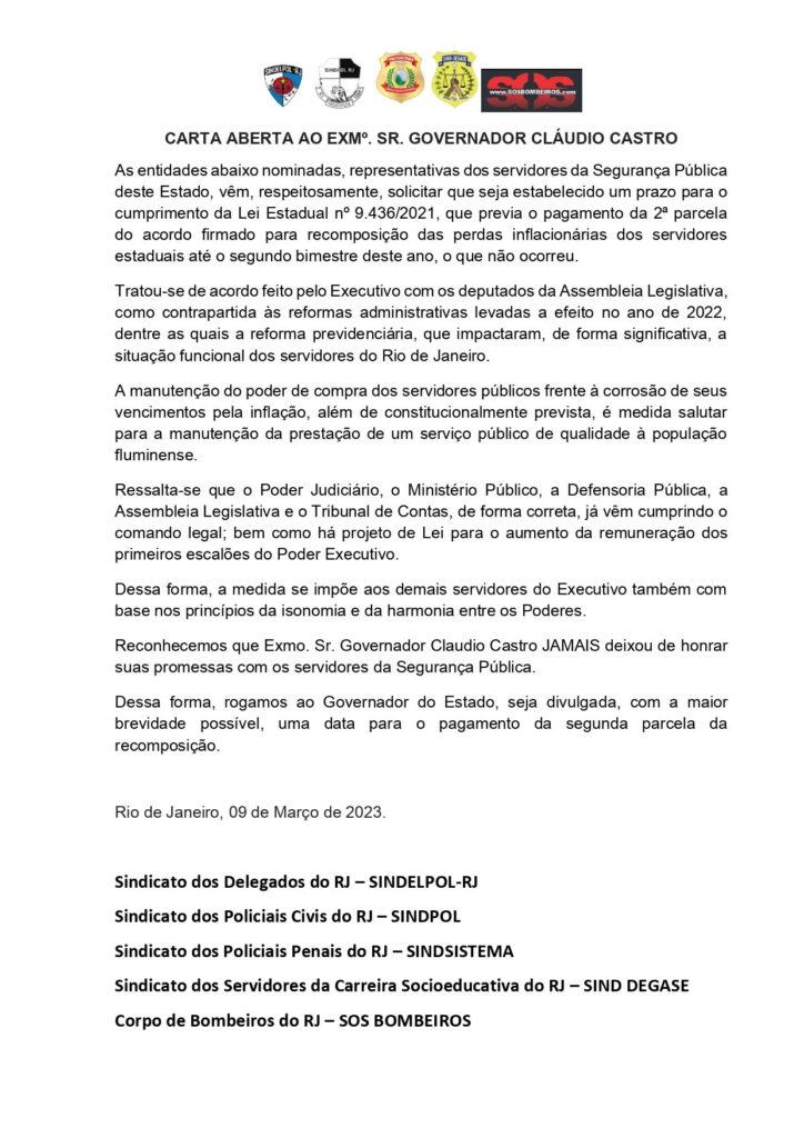 Ao final da reunião, as entidades representativas dos servidores da Segurança Pública do Estado elaboraram uma Carta Aberta ao Governador Cláudio Castro solicitando a divulgação de uma data para o pagamento da segunda parcela da recomposição.
